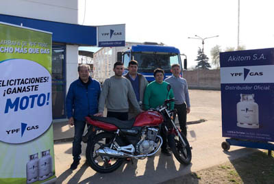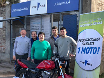 El jueves pasado a través de la Promoción efectuada por YPF Gas junto a toda la red de distribuidores, se realizó la entrega del premio y esta vez fue el turno de Daniel Moffardin, quien se ganó una de las 24 motos sorteadas en todo el país y que en este caso la entrega se realizó en el depósito del Distribuidor Oficial Akitom SA en Moreno.