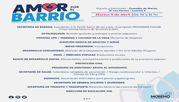 El Programa “Amor por el Barrio” acerca de manera itinerante asesoramiento, acompañamiento y distintos servicios a las vecinas y los vecinos de Moreno. En esta oportunidad, el operativo estará presente el martes 5 de abril en Cuartel V, en el Comedor de Marta, ubicado en la calle Oyuela y Sarmiento, en el barrio Los Hornos, de 10 a 14 horas. En caso de lluvias la actividad se suspende.