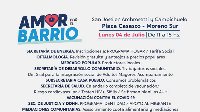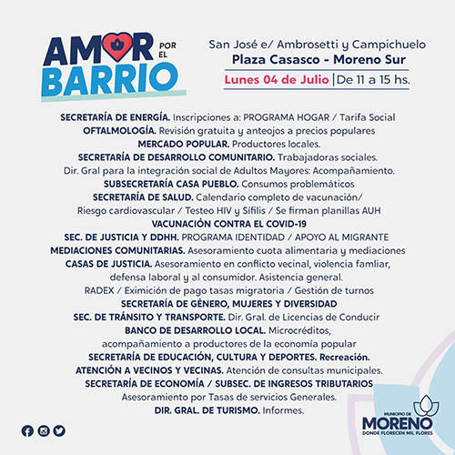 El Programa “Amor por el Barrio” acerca de manera itinerante asesoramiento, acompañamiento y distintos servicios a las vecinas y los vecinos de Moreno. En esta oportunidad, el operativo estará presente el lunes 4 de julio, en la Plaza Casasco, ubicada en la calle San José entre Ambrosetti y Campichuelo, en Moreno Sur, de 11 a 15 horas. En caso de lluvias la actividad se suspende.
