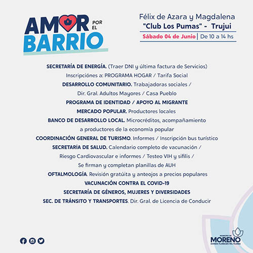 El Programa “Amor por el Barrio” acerca de manera itinerante asesoramiento, acompañamiento y distintos servicios a las vecinas y los vecinos de Moreno. En esta oportunidad, el operativo estará presente el sábado 4 de junio, en el Club “Los Pumas”, ubicado en la calle Félix de Azara y Magdalena, en Trujui, de 10 a 14 horas. En caso de lluvias la actividad se suspende.