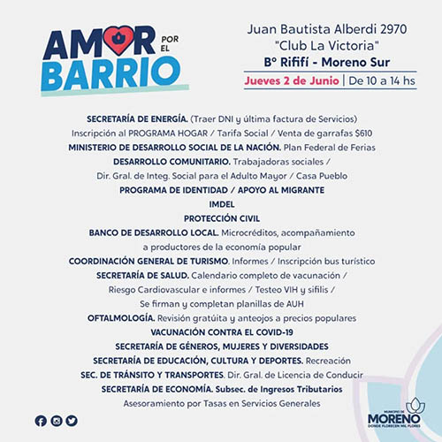 El Programa “Amor por el Barrio” acerca de manera itinerante asesoramiento, acompañamiento y distintos servicios a las vecinas y los vecinos de Moreno. En esta oportunidad, el operativo estará presente el jueves 2 de junio, en el Club “La Victoria”, ubicado en la calle Juan Bautista Alberdi 2970, en el barrio Rififí, de 10 a 14 horas. En caso de lluvias la actividad se suspende.