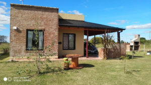Cada Cabaña tiene su propia cochera cubierta con alero que rodea hasta la entrada. Parrilla y banquetas y una mesa exterior reciclada con banquetas (próximamente sillas).