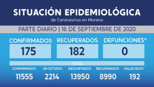 en el Municipio de Moreno hay 175 nuevos casos confirmados y 182 casos recuperados. En total suman 11555 casos confirmados, 2214 casos sospechosos y 13950 casos descartados.