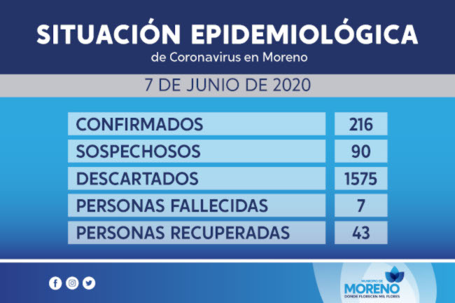 Al domingo de 7 de junio, en el municipio de Moreno se registraron 1881 notificaciones de casos, el 83% resultaron negativos y el 11% resultaron positivos. Del total, 216 corresponden a casos confirmados, 90 a casos sospechosos y 1575 a casos descartados. Al momento, se necesitaron 20 días para duplicar la cantidad de casos.