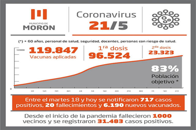 Desde la noche del martes 18 se notificaron 717 casos positivos de coronavirus (340 mujeres y 376 hombres), que llevan el número de casos confirmados a 31.483 personas domiciliadas en el distrito, desde el inicio de la pandemia. Los recuperados llegaron a 28.193 moronenses, luego de informarse 444 altas médicas en los últimos cuatro días. Los decesos ya son 1000, tras el fallecimiento de 11 hombres de 43, 44, 55, 58, 64, 66, 69, 69, 72, 74 y 79 años y 9 mujeres de 46, 54, 68, 75, 85, 86, 87, 87 y 96 años, comunicado hoy en el Sistema Integrado de Información Sanitaria Argentino.