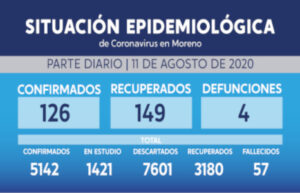 Al día de ayer, en el municipio de Moreno hay 126 nuevos casos confirmados, 149 casos recuperados y 4 defunciones. En total suman 5142 casos confirmados, 1421 casos sospechosos, 7601 casos descartados y los decesos acontecidos por Covid-19 residentes en Moreno son 57, de los cuales 31 casos su defunción se encontraba asociada al evento.