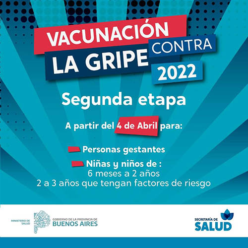 En el marco de la segunda etapa del Plan Anual de Vacunación Bonaerense contra la gripe, a partir del 4 de abril tienen prioridad y podrán vacunarse contra la gripe las personas gestantes y las niñas y niños de 6 meses a 2 años, y de 2 a 3 años que posean factores de riesgo en todas las Unidades Sanitarias del distrito.