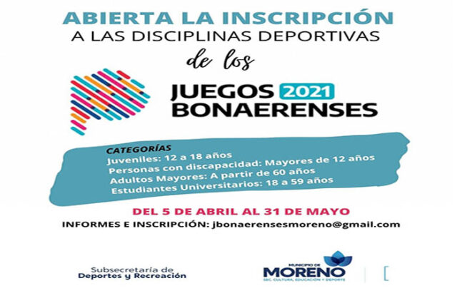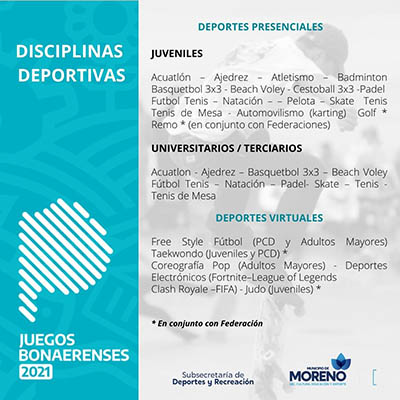 La Subsecretaria de Deportes y Recreación informa que continúa la inscripción, hasta el 31 de mayo, para participar de la 30º edición de los Juegos Bonaerenses 2021 que se realizarán de manera presencial o virtual dependiendo de cada disciplina y grupos etarios, dado el contexto sanitario.
