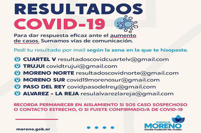 La Municipalidad de Moreno ha informado que el resultado de los análisis de Covid-19 se puede solicitar enviando los datos personales: nombre; apellido y DNI al correo electrónico: [email protected].