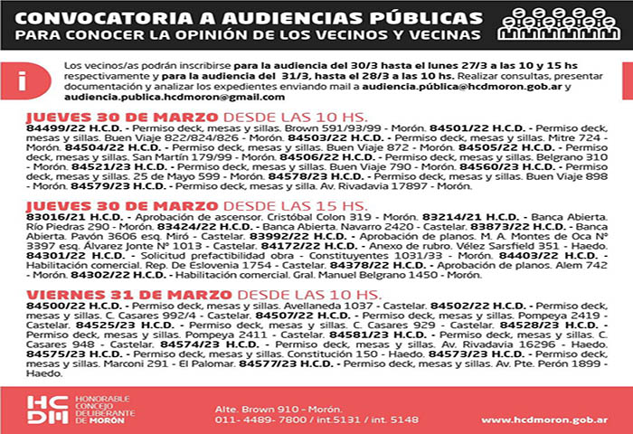 El Honorable Concejo Deliberante de Morón, convoca a Audiencias Públicas a desarrollarse los días Jueves 30 y viernes 31 de marzo.