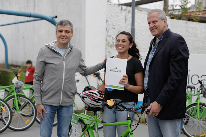 El intendente Juan Zabaleta, junto al rector de la Universidad Nacional de Hurlingham, Jaime Perczyk, participó de la entrega de las primeras 100 bicicletas a estudiantes que cursan distintas carreras en esta institución de estudios superiores. Esta política forma parte del programa de Becas de Ayuda Económica UNAHUR, que se financia con fondos de la Universidad.