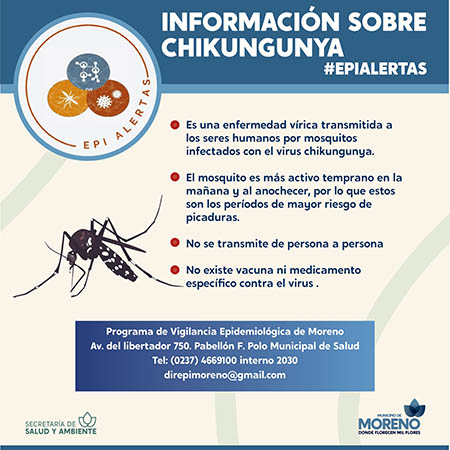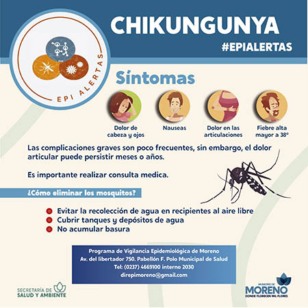 Debido al reporte de aumento de casos de Fiebre Chikungunya en Paraguay, y la presenciade casos sin antecedente de viaje en algunos municipios de la Provincia, el Municipio de Moreno aconseja a la comunidad, consultar en las Unidades Sanitarias (US) más cercanas a su domicilio en caso de presentar los siguientes síntomas: