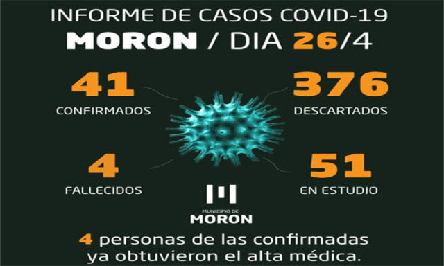 Con estas tres personas el número de moronenses confirmados hasta el día de hoy asciende a 41, de los cuales cuatro hombres -de 79, 80, 90 y 93 años- fallecieron y cuatro obtuvieron el alta médica.
