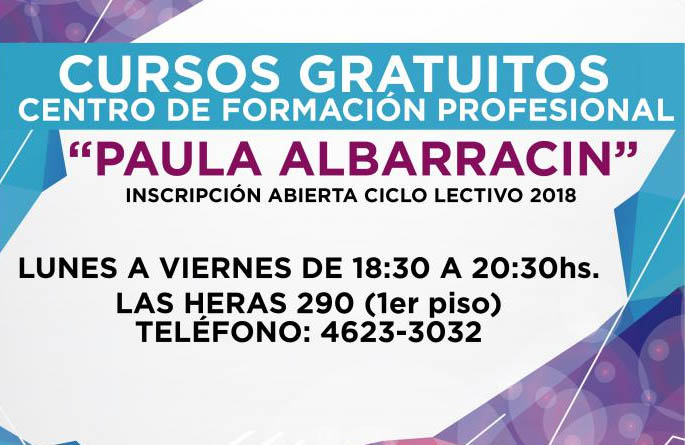 Apartir del 1 de julio estará abierta la inscripción a los cursos gratuitos del segundo cuatrimestre del ciclo lectivo 2019 del Centro de Formación Profesional “Paula Albarracín” dependiente de la Secretaría de Promoción Social y Políticas Culturales del Municipio de ituzaingó.