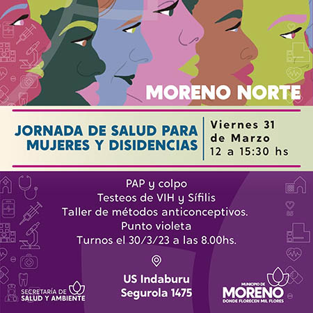 El Municipio de Moreno, a través de la Secretaría de Salud y Ambiente llevará a cabo este viernes 31 de marzo de 12 a 15.30 horas una jornada integral de salud para mujeres y disidencias en la Unidad Sanitaria Indaburu, ubicada en Segurola 1475, en la localidad de Moreno Norte.