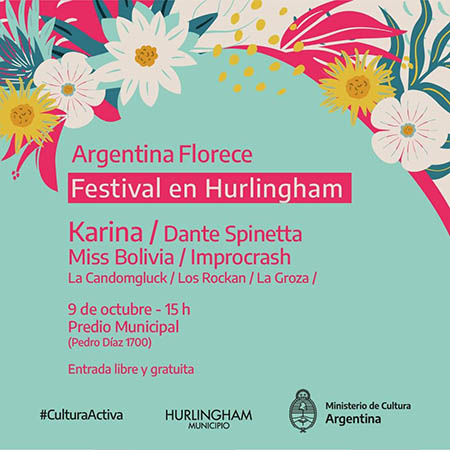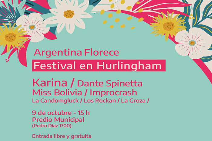 El próximo sábado 9 de octubre desde las 15 hs. se realizará en Hurlingham el festival musical “Argentina Florece”, organizado por el municipio y por el Ministerio de Cultura de la Nación, que contará con las presentaciones de la cantautora y compositora Karina, el músico Dante Spinetta y la cantante Miss Bolivia. También se presentarán la banda de percusión hurlinghense La Candomgluck, la agrupación de clown y música Los Rockan y la banda de cuarteto La Groza.