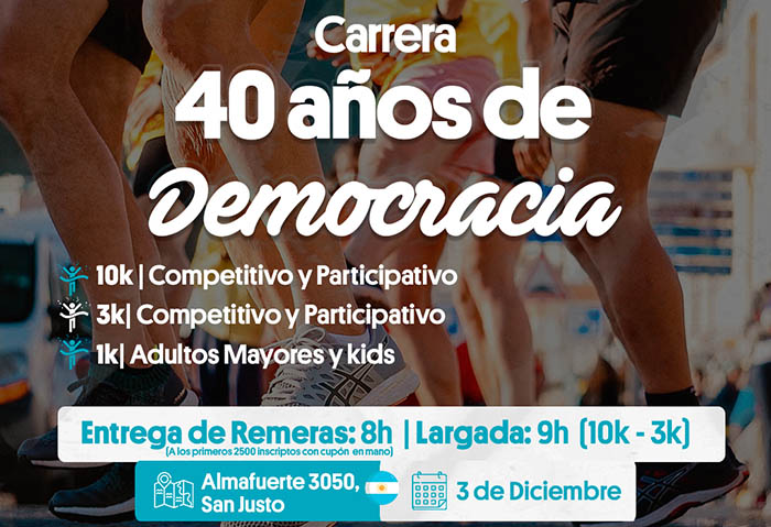 El Municipio local organiza la «Carrera por los 40 años de la Democracia», para el domingo 3 de diciembre a las 8 horas en la Plaza General San Martín de San Justo (frente al municipio), Almafuerte 3050. Inscripción gratuita y las vecinas y hasta el 24 de noviembre.