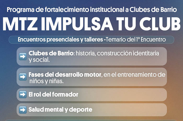 El Gobierno local presenta MTZ Impulsa Tu Club, una propuesta destinada a potenciar a los clubes. Con encuentros y talleres, el programa de fortalecimiento institucional abordará aspectos clave para la formación deportiva integral de chicos y chicas, y brindará nuevas herramientas de gestión y desarrollo.