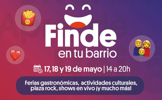 Este fin de semana, 17, 18 y 19 de mayo, “Finde en Tu Barrio” tendrá lugar en las localidades de Isidro Casanova, Gregorio de Laferrere, González Catán y Virrey del Pino, desde las 14 horas, y el público disfrutará ferias gastronómicas, actividades culturales, plaza rock, shows en vivo, ¡y mucho más!