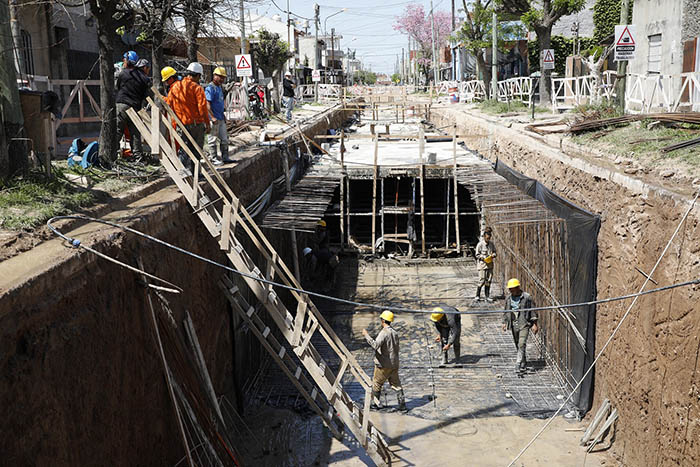 Construcción del tramo final del Aliviador 1: 832 metros desde la calle Hernández hasta el conducto existente en Comodoro Py, cruzando Ruta 21 y las vías del Ferrocarril Belgrano.