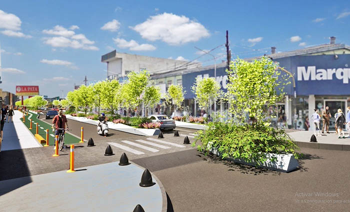 El proyecto contempla la colocación de mobiliario urbano, luminarias led, nuevas veredas y parquización –como se aprecia en el render- sobre 19 cuadras, desde la Ruta 23 hasta la calle Canadá. Un tramo fundamental ya que se trata de una de las arterias principales y casco céntrico de la localidad.