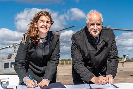 La intendenta de Moreno, Mariel Fernández, junto al presidente de la Nación, Alberto Fernández y el ministro de Defensa, Jorge Taiana, firmaron un convenio para crear un Parque Logístico de carga y de un Aeropuerto para uso civil en la Base Aérea ubicada en Cuartel V.