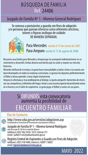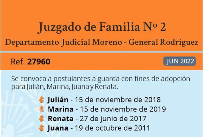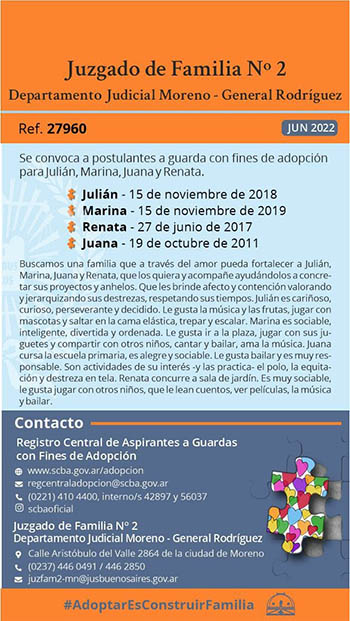 En el partido de Moreno siguen vigentes las convocatorias a personas y familias adoptantes, dispuestas a cuidar, preservar y respetar todos y cada uno de los derechos de las niñas y niños en adopción.