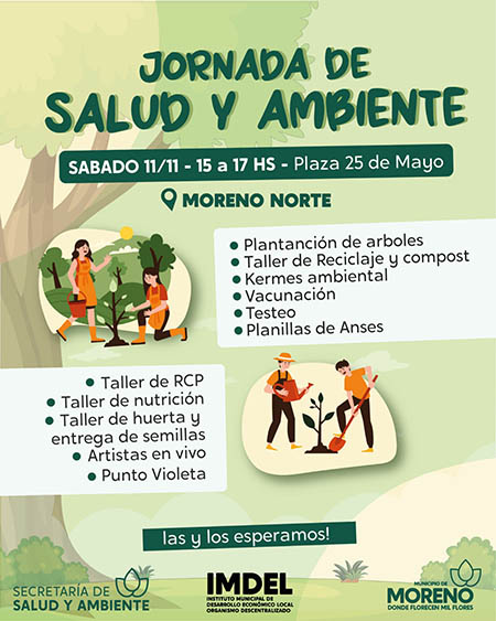 La Municipalidad de Moreno, a través de la Secretaría de Salud y Ambiente en articulación con el Instituto Municipal de Desarrollo Económico Local (IMDEL), realizará una jornada de salud y ambiente, el sábado 11 de noviembre, de 15 a 17 horas, en la plaza 25 de Mayo, Moreno Norte.