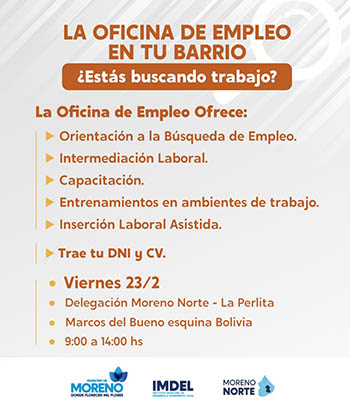 El Municipio Local brinda propuestas de inserción laboral y herramientas de formación y capacitación para la comunidad. Por esa razón recibirá Curriculums Vitae hoy viernes 23 de febrero, en la Delegación Municipal de Moreno Norte – La Perlita, ubicada en Marcos del Bueno esquina Bolivia, de 9 a 14 horas. Las personas que deseen acercarse deben llevar también su DNI.