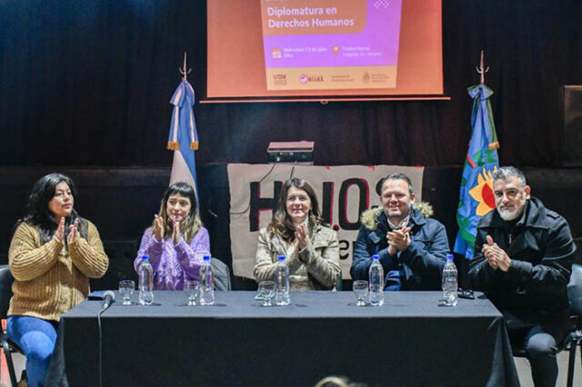 Con la presencia de la intendenta de Moreno, Mariel Fernández; Carolina Brandariz, directora Nacional de cuidados integrales del Ministerio de Desarrollo; Charly Pisoni, integrante de H.I.J.OS Capital; Juan Torrez, integrante de H.I.J.O.S. Moreno y Silvina Cansino, directora general de Derechos Humanos, se llevó adelante el acto de inicio de la diplomatura en Derechos Humanos.
