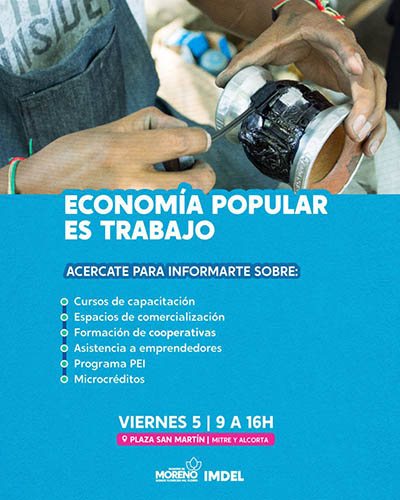 El Municipio de Moreno, a través del Instituto Municipal de Desarrollo Económico Local (IMDEL), realizará una jornada integral de economía popular, bajo el lema “La economía popular es trabajo”, el viernes 5 de mayo a la plaza San Martín, de 9 a 17 horas.