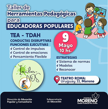 La Municipalidad de Moreno, a través de la Dirección de Educación Popular y Comunitaria de la Subsecretaría de Educación, en conjunto con la ONG “Incluir Nos”, desarrollará un taller de Herramientas Pedagógicas para educadoras populares, el martes 9 de mayo, a las 10 horas, en el teatro Roma, ubicado en Uruguay 33.