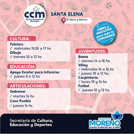 El Municipio de Moreno, a través de la Secretaría de Cultura, Educación y Deporte, brinda talleres libres y gratuitos para toda la comunidad que se dictan en los Centros Comunitarios Municipales (CCM) de todo el distrito y para todas las edades.
