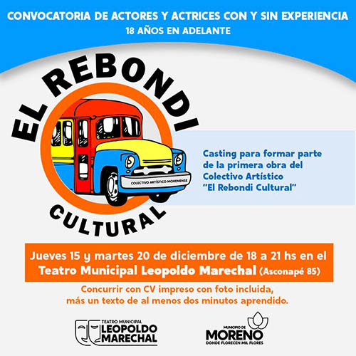 El Municipio de Moreno, a través de la Secretaría de Cultura, Educación y Deporte, invita a las y los vecinos a participar del casting para formar parte de la primera obra del Colectivo Artístico “El Rebondi Cultural”, que se realizará los días jueves 15 y martes 20 de diciembre, de 18 a 21 horas, en el Teatro Municipal “Leopoldo Marechal”, ubicado en Asconapé 85.