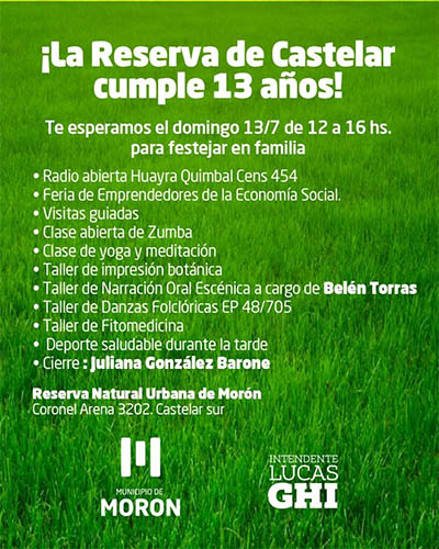 Este domingo 13 de julio, el Municipio de Morón realizará una jornada especial por el 13º aniversario de la Reserva Natural Urbana (RNU) de Castelar, un pulmón verde clave para la preservación ambiental y la vida comunitaria. La celebración será al aire libre, con entrada libre y gratuita, y ofrecerá propuestas culturales, recreativas y ecológicas para todas las edades.