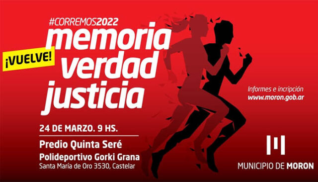 El Municipio de Morón organiza la maraton que se disputará, en conmemoración del último Golpe de Estado, el próximo 24 de marzo a las 9 horas en el Predio Quinta Seré, Polideportivo Gorki Grana.