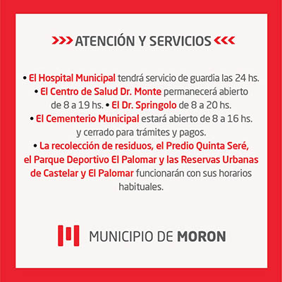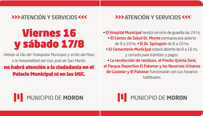 El Municipio de Morón dio a conocer como será el funcionamiento de los principales servicios durante el asueto por el Día del Trabajador Municipal, mañana viernes 16 y el feriado por el Día del Paso a la Inmortalidad del General José de San Martín, el sábado 17 de agosto.