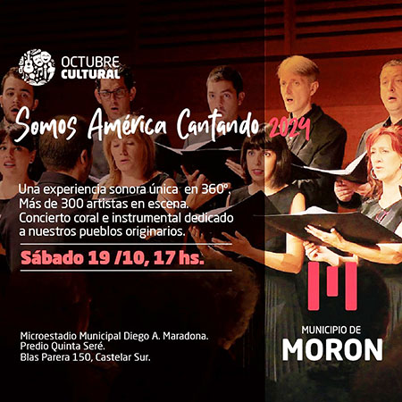 El próximo sábado 19 de octubre, el Municipio de Morón será el escenario de un evento único que reunirá a más de 300 artistas en el encuentro coral «Somos América Cantando». La cita es a las 17 horas en el Microestadio Municipal Diego Maradona, donde 30 agrupaciones corales se darán cita para ofrecer un espectáculo inédito con una perfomance de 360 grados, dedicado a los pueblos originarios y sus lenguas.