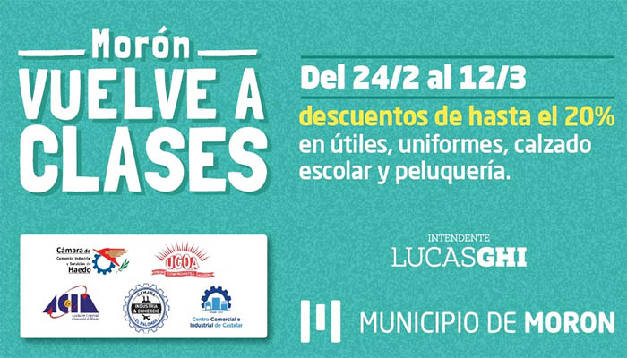 El Municipio de Morón pone en marcha la cuarta edición de “Morón Vuelve a Clases”, el programa que ofrece descuentos de entre el 10% y el 20% en la compra de útiles, mochilas, indumentaria, calzado escolar y peluquería, en comercios adheridos del distrito.