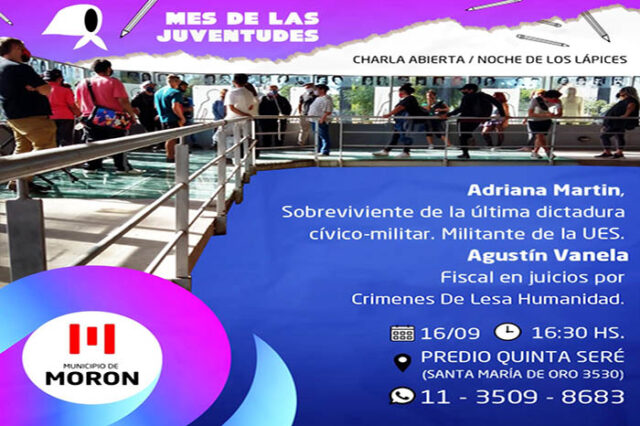 A partir de las 16:30, tendrá lugar una charla abierta en el Predio Quinta Seré (Santa María de Oro 3530, Castelar) con la participación de Adriana Martín, sobreviviente de la última dictadura cívico-militar y militante de la UES (Unión de Estudiantes Secundarios), y Agustín Vanela, fiscal en juicios por crímenes de lesa humanidad. Luego, se hará una recorrida por el Espacio Memoria Mansión Seré, lugar que funcionó como centro clandestino de detención.