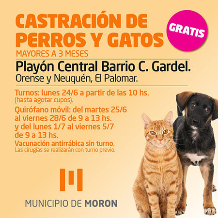 Del 25 al 28 de junio y del 1 al 5 de julio, el quirófano móvil estará en el Playón Central Barrio Carlos Gardel, Orense y Neuquén de El Palomar, realizando castraciones y vacunación antirrábica para perros y gatos.