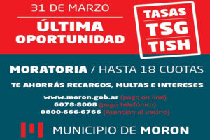 El Municipio de Morón lanzó una última oportunidad de moratoria extraordinaria con un plazo de tiempo hasta el 31 de marzo. De esta manera, quienes adeudan tasas residenciales o empresarias a la comuna podrán obtener quitas de hasta el 100% en recargos, multas e intereses, suscribiendo planes de pago de hasta 18 cuotas mensuales.