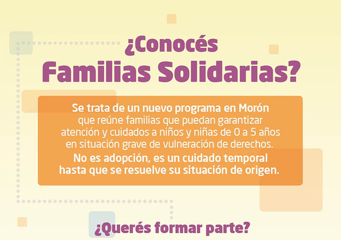 El Municipio de Morón abrió la convocatoria al nuevo programa “Familias Solidarias”, una iniciativa que convoca a hogares dispuestos a cuidar de manera temporal y afectiva a niñas y niños de entre 0 y 5 años que, por diversos motivos, no pueden vivir con sus familias de origen.