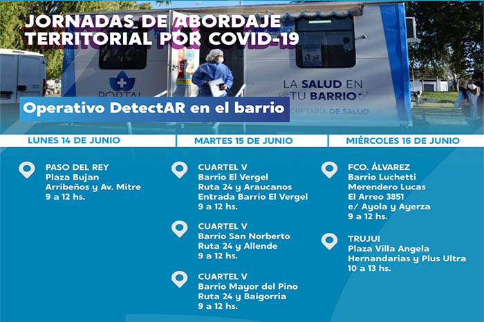 Estas jornadas de abordaje territorial se llevan a cabo en diferentes barrios mediante los equipos de la Secretaria de Salud, promotoras y referentes comunitarios con el objetivo de la detección temprana, el cuidado de los casos confirmados y el aislamiento para minimizar la transmisión del coronavirus y cortar, de este modo, la cadena viral en nuestro distrito.
