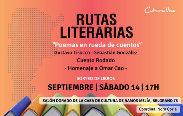 El ciclo literario de Cultura Viva “Rutas Literarias”, propone en su nueva edición, el próximo sábado 14 de septiembre una tarde dedicada a la poesía a través de la obra de los escritores Gustavo Tisocco, Sebastián González y Cuento Rodado, a cargo del grupo de narración Rueda de Libros integrado por Ana de Diego, Susana Kowal, Betty Massolo, Liliana Plos y Alicia Siaba.