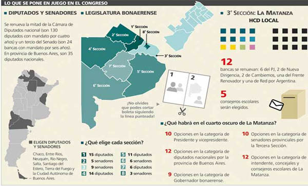 Este año se renueva, también, la mitad de la Cámara de Diputados y un tercio del Senado. Los bonaerenses elegirán a los 35 diputados que los representan a nivel nacional, dado que renovaron senadores en 2017, y a sus legisladores provinciales. Como parte de la Tercera Sección Electoral bonaerense, los matanceros deberán elegir a nueve senadores para la Legislatura entre las diez listas que presentarán candidatos para esa categoría.