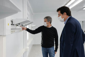 El intendente Juan Zabaleta y el ministro del Interior de la Nación, Eduardo “Wado” de Pedro, recorrieron el Hospital Modular de Emergencia de Hurlingham, donde destacaron el fortalecimiento del sistema de salud que encaró el gobierno nacional para atender la situación de la pandemia. La obra civil ya se encuentra finalizada y actualmente se trabaja en la fase de equipamiento sanitario.
