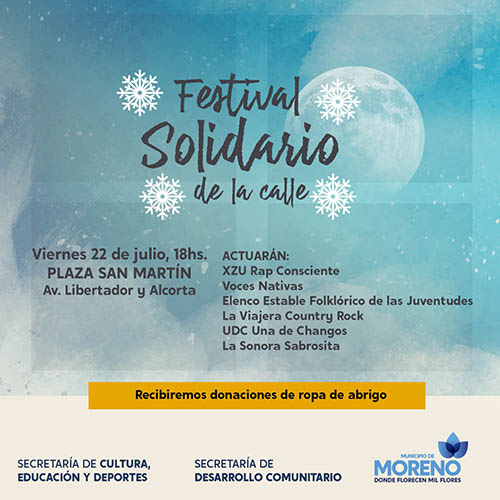 Por otra parte, el día viernes 22 de julio se realizará el “Festival solidario de la calle”, en la Plaza San Martín, a partir de las 18 horas, con el objetivo de juntar donaciones de ropa de abrigo, para poder ofrecer mayor cuidado y asistencia a quienes más lo necesiten durante los días de bajas temperaturas.