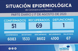 Al día de ayer en el municipio de Moreno hay 51 nuevos casos confirmados, 69 casos recuperados y una defunción. En total suman 6083 casos confirmados, 1533 casos sospechosos, 8602 casos descartados y los decesos acontecidos por Covid-19 residentes en Moreno son 67, de los cuales 37 casos su defunción se encontraba asociada al evento. Al momento, se necesitan 30.9 días para duplicar la cantidad de casos.