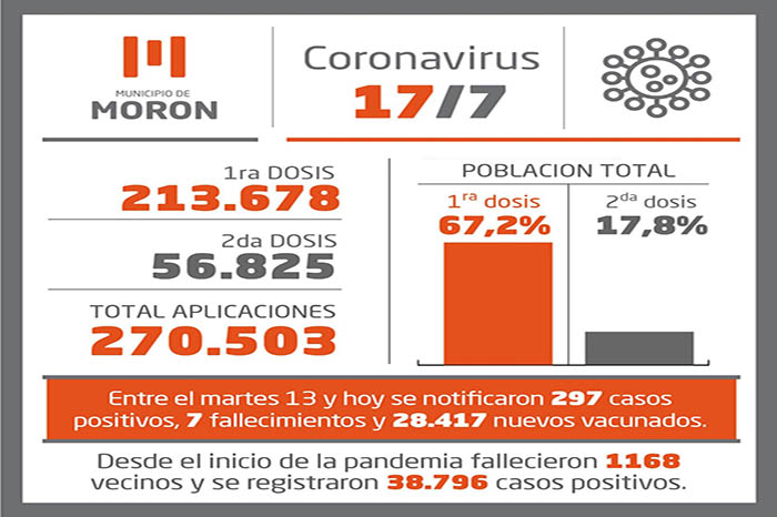 Desde el último martes a la noche se registraron 297 casos positivos de coronavirus entre la población del distrito. Se trata de 149 mujeres y 148 hombres que elevan la cantidad de casos confirmados a 38.796; mientras que las altas médicas sumaron 304 personas y alcanzaron las 36.187 desde el inicio de la pandemia. En los últimos tres días se registraron 7 nuevos fallecimientos, dos mujeres de 77 y 92 años y cinco varones de 31, 54, 60, 65 y 67 años por lo que actualmente los moronenses que murieron como consecuencia del Covid-19 son 1.168.